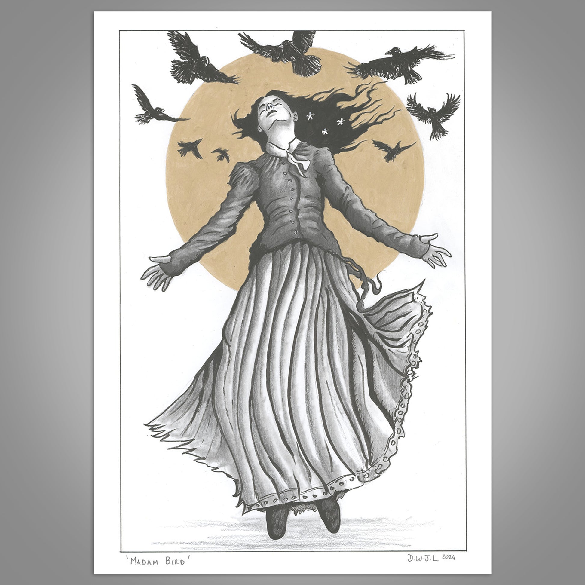 Madam Bird is a mythical character based on ideas and themes of Celtic folklore and magical realism. She not only has power over winged creatures, but the gift of flight itself. An original artwork made on paper, it's available framed or unframed, painted with gold ink, black ink and pencils and then varnished to protect the surface.
